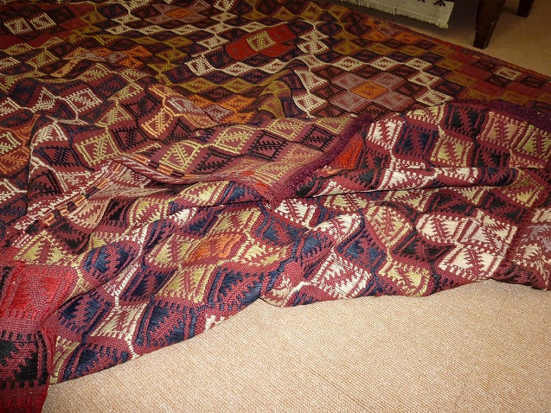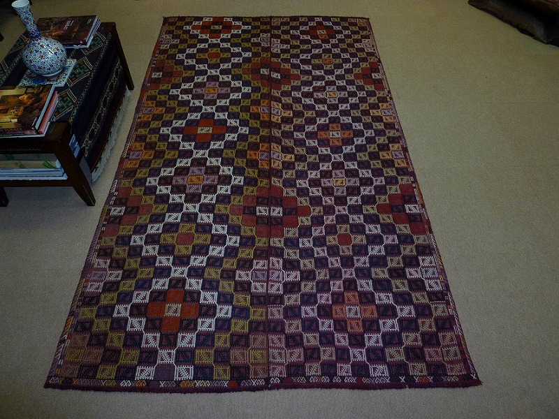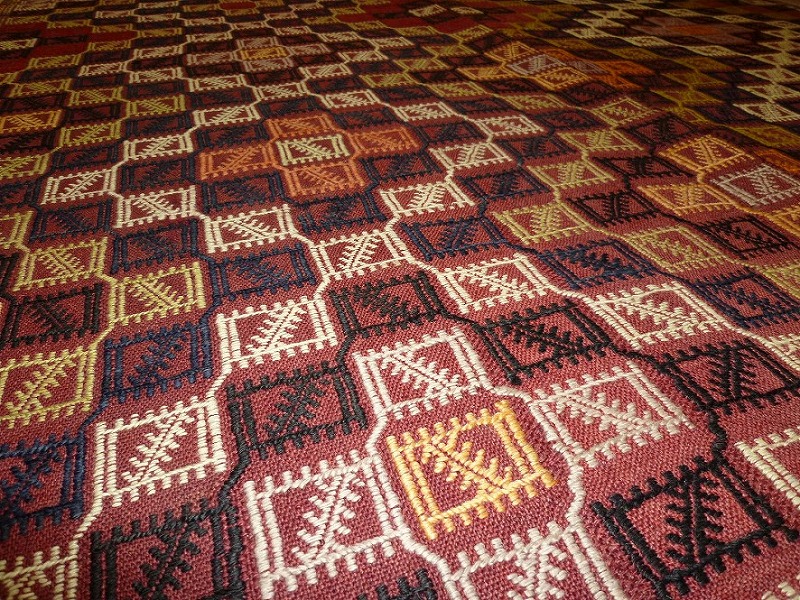 50~60年前のものです。繊細な織りと、大胆なデザインデと色彩。一枚あるだけで、オリジナリティあふれる空間をつくり出してくれます。本キリムに使用の糸は、すべて草木染めです。機械織りとは異なり、暖かみが伝わるハンドメイドです。使われた様子はなく、ほとんどダメージはありません。ふさの根元の部分は、横糸が出てこないように丁寧に仕上げています。リーズナブルなプライスでご満足いただけると思います。