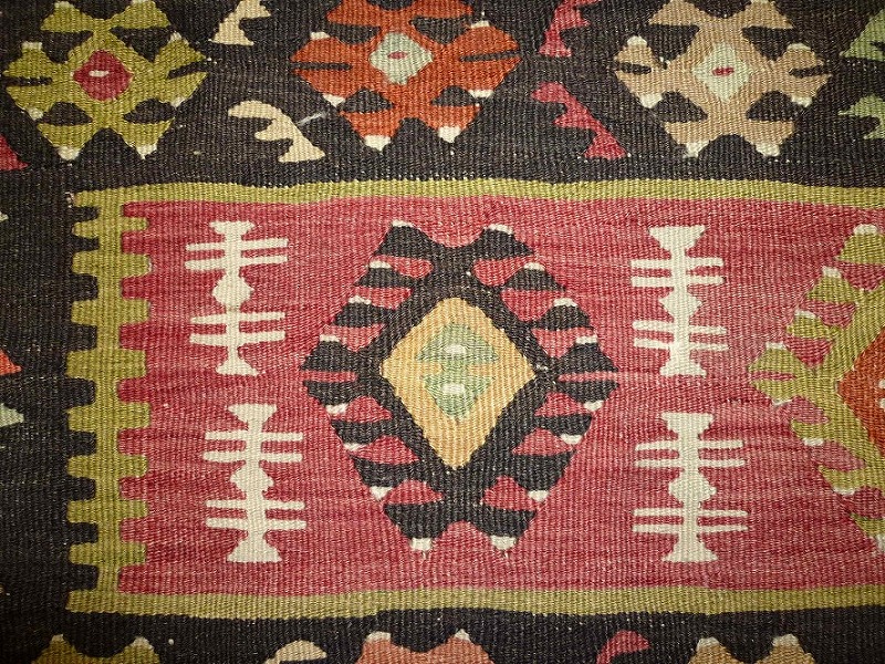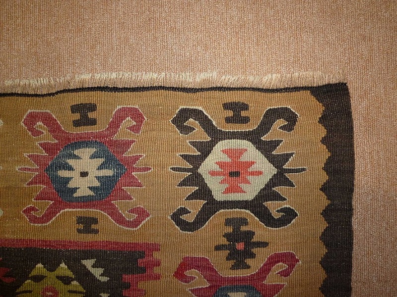 50~60年前のものです。繊細な織りと、大胆なデザインデと色彩。一枚あるだけで、オリジナリティあふれる空間をつくり出してくれます。本キリムに使用の糸は、すべて草木染めです。機械織りとは異なり、暖かみが伝わるハンドメイドです。使われた様子はなく、ほとんどダメージはありません。ふさの根元の部分は、横糸が出てこないように丁寧に仕上げています。リーズナブルなプライスでご満足いただけると思います。