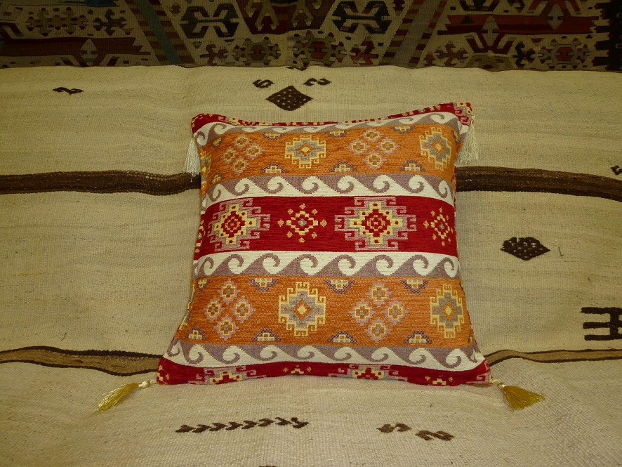オスマントルコの伝統紋様を、あなたのお部屋に!このシリーズに使用している布地は、キリムではありませんが古くからトルコに伝わっている素晴らしいデザ インを、クッションカバーに取り入れたファブリック製品です。エキゾチックなトルコ製のクッションカバーを、あなたのお部屋に!古くからトルコに伝わる、 伝統のデザイン・モチーフを織り込んであります。デザインの豪華さ、手軽に洗濯のできる丈夫さ、そしてこのリーズナブルなプライス、どれをとっても大満 足!