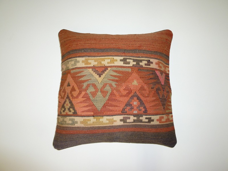キリムクッションカバーオールドキリムを使用して作られた、エキゾチックなクッションカバー。オールドキリムの素敵な部分をカットして使用されています。(表面はオールドキリム、裏側はコットンの布地です)お手持ちの家具やキリムと組み合わせてお楽しみください。このタイプのものは、なかなか数が少な く、品質・価格・品揃え共に日本国内屈指であると自負しています。