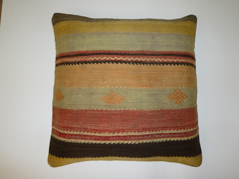 キリムクッションカバーオールドキリムを使用して作られた、エキゾチックなクッションカバー。オールドキリムの素敵な部分をカットして使用されています。(表面はオールドキリム、裏側はコットンの布地です)お手持ちの家具やキリムと組み合わせてお楽しみください。このタイプのものは、なかなか数が少な く、品質・価格・品揃え共に日本国内屈指であると自負しています。