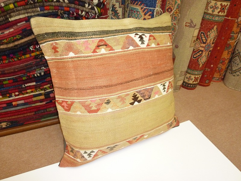 キリムクッションカバーオールドキリムを使用して作られた、エキゾチックなクッションカバー。オールドキリムの素敵な部分をカットして使用されています。(表面はオールドキリム、裏側はコットンの布地です)お手持ちの家具やキリムと組み合わせてお楽しみください。このタイプのものは、なかなか数が少な く、品質・価格・品揃え共に日本国内屈指であると自負しています。