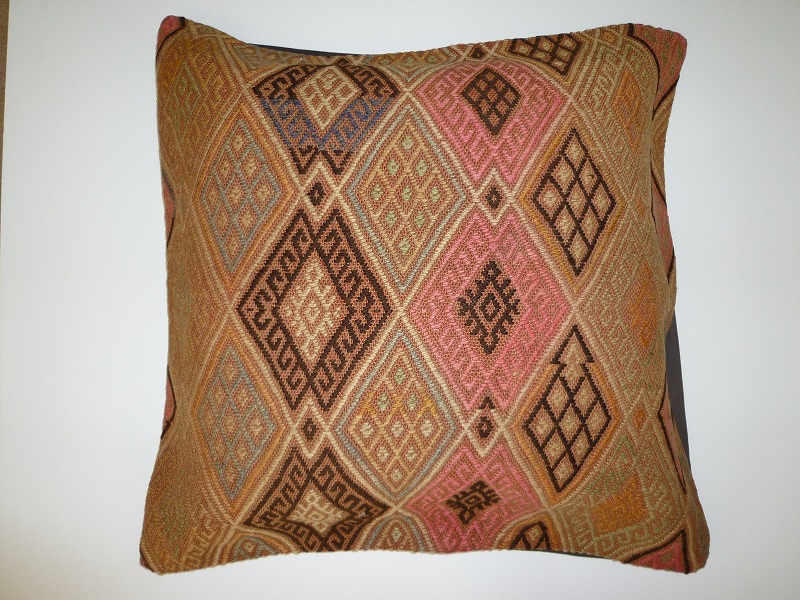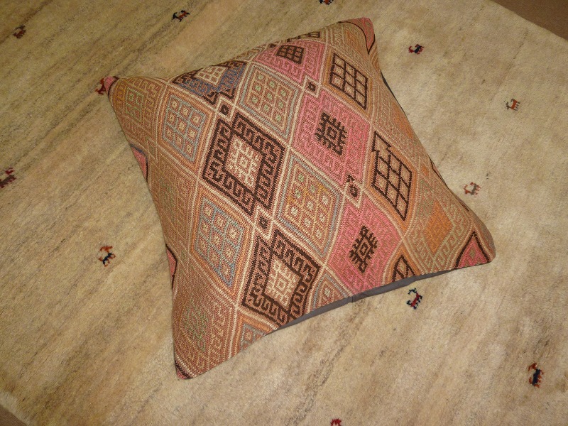 キリムクッションカバーオールドキリムを使用して作られた、エキゾチックなクッションカバー。オールドキリムの素敵な部分をカットして使用されています。(表面はオールドキリム、裏側はコットンの布地です)お手持ちの家具やキリムと組み合わせてお楽しみください。このタイプのものは、なかなか数が少な く、品質・価格・品揃え共に日本国内屈指であると自負しています。