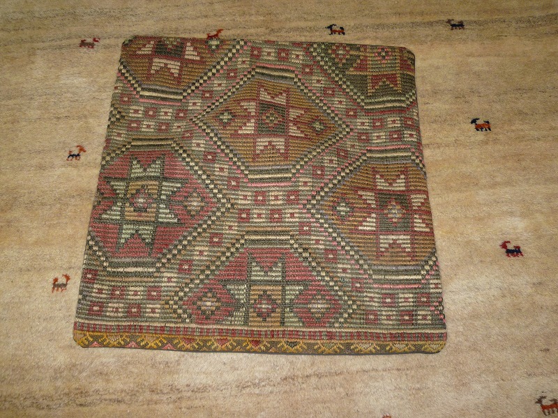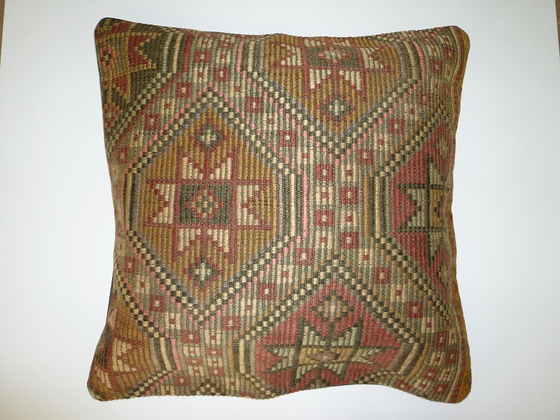 キリムクッションカバーオールドキリムを使用して作られた、エキゾチックなクッションカバー。オールドキリムの素敵な部分をカットして使用されています。(表面はオールドキリム、裏側はコットンの布地です)お手持ちの家具やキリムと組み合わせてお楽しみください。このタイプのものは、なかなか数が少な く、品質・価格・品揃え共に日本国内屈指であると自負しています。