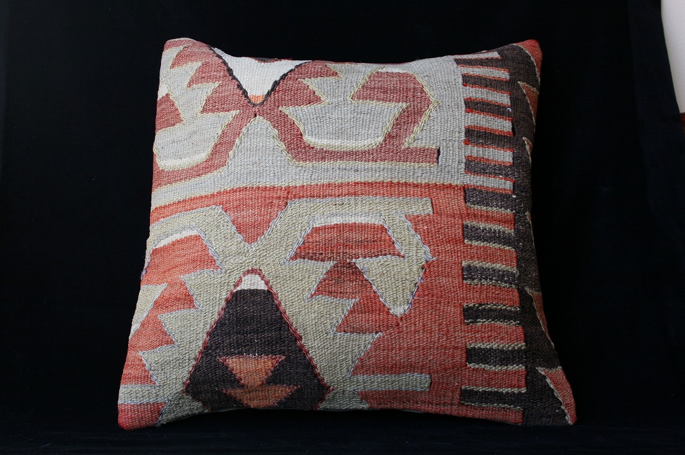 オールドキリムを使用して作られた、エキゾチックなクッションカバー。オールドキリムの素敵な部分をカットして使用されています。(表面はオールドキリム、裏側はコットンの布地です)お手持ちの家具やキリムと組み合わせてお楽しみください。このタイプのものは、なかなか数が少な く、品質・価格・品揃え共に日本国内屈指であると自負しています。