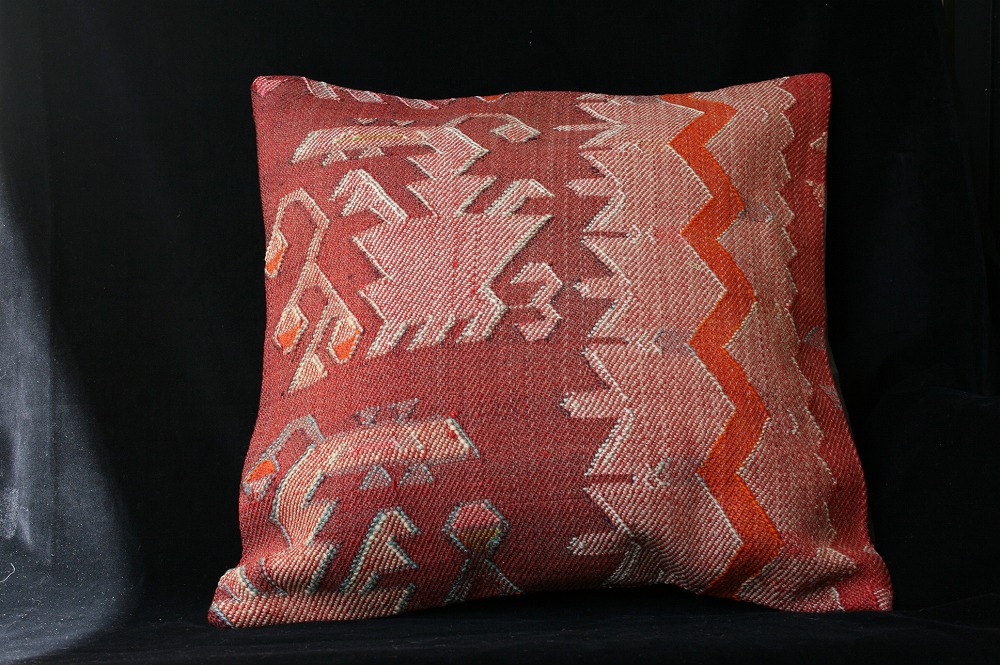 オールドキリムを使用して作られた、エキゾチックなクッションカバー。オールドキリムの素敵な部分をカットして使用されています。(表面はオールドキリム、裏側はコットンの布地です)お手持ちの家具やキリムと組み合わせてお楽しみください。このタイプのものは、なかなか数が少な く、品質・価格・品揃え共に日本国内屈指であると自負しています。