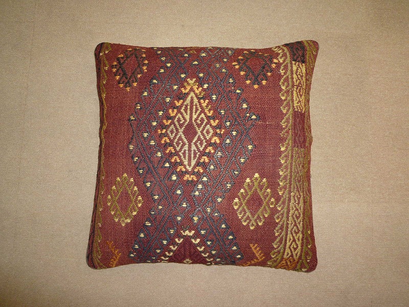 オールドキリムを使用して作られた、エキゾチックなクッションカバー。オールドキリムの素敵な部分をカットして使用されています。(表面はオールドキリム、裏側はコットンの布地です)お手持ちの家具やキリムと組み合わせてお楽しみください。このタイプのものは、なかなか数が少な く、品質・価格・品揃え共に日本国内屈指であると自負しています。