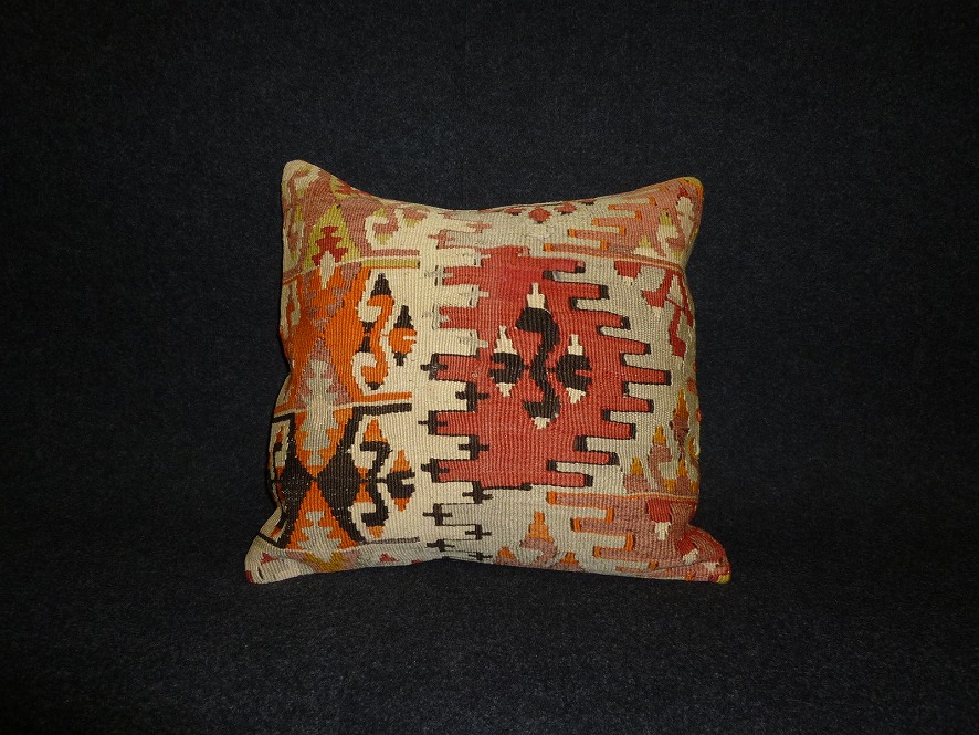 [z75]オールドキリムを使用して作られた、エキゾチックなクッションカバー。オールドキリムの素敵な部分をカットして使用されています。(表面はオールドキリム、裏側はコットンの布地です)お手持ちの家具やキリムと組み合わせてお楽しみください。このタイプのものは、なかなか数が少な く、品質・価格・品揃え共に日本国内屈指であると自負しています。