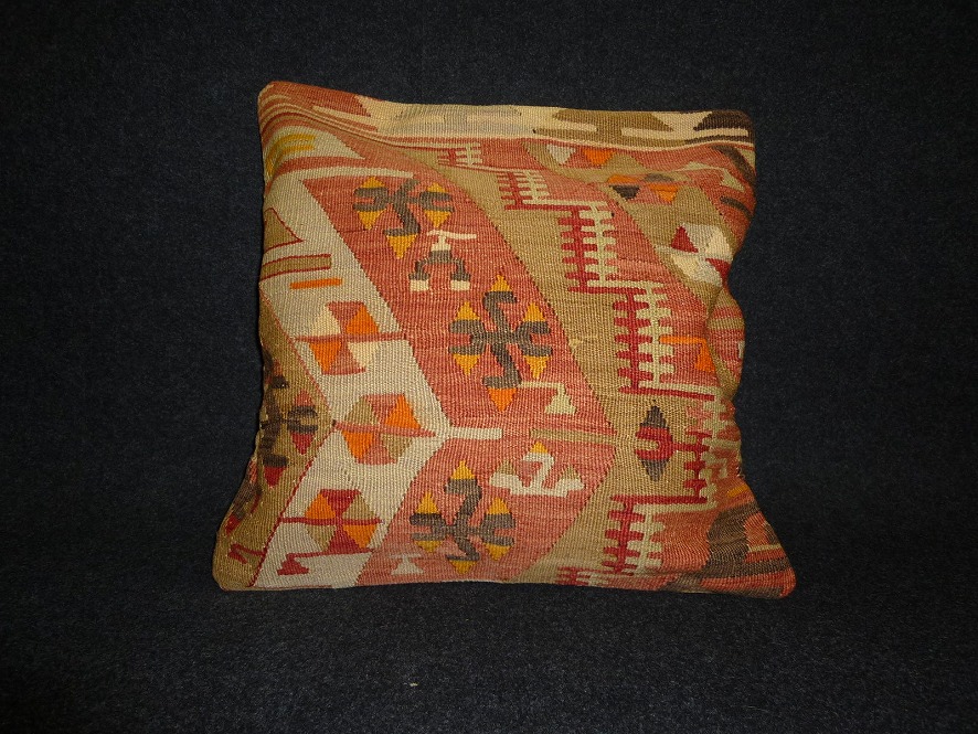 [z77]オールドキリムを使用して作られた、エキゾチックなクッションカバー。オールドキリムの素敵な部分をカットして使用されています。(表面はオールドキリム、裏側はコットンの布地です)お手持ちの家具やキリムと組み合わせてお楽しみください。このタイプのものは、なかなか数が少な く、品質・価格・品揃え共に日本国内屈指であると自負しています。
