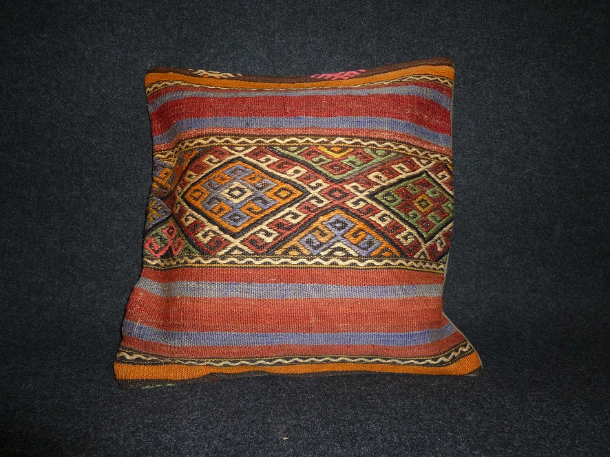 [z81]オールドキリムを使用して作られた、エキゾチックなクッションカバー。オールドキリムの素敵な部分をカットして使用されています。(表面はオールドキリム、裏側はコットンの布地です)お手持ちの家具やキリムと組み合わせてお楽しみください。このタイプのものは、なかなか数が少な く、品質・価格・品揃え共に日本国内屈指であると自負しています。