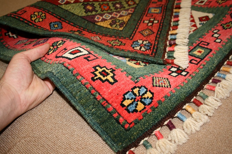 毛足が短く、お掃除が楽です。中心に多彩な模様があり、多目的な部屋に最適です。ダブル結びというトルコならではの技法です。また、現地のトルコでも日本人観光客に人気の商品です。サイドにあるふさも 細かく細工が施してあります。表面も大変柔らかく、使いこむほどに風合いを重ね遊び毛が出ないのがこの種類の絨毯の長所です。全体としては、トルコの伝統的な柄を取り入れてあります。機械織りとは異なり、暖かみが伝わるハンドメイド。サイズもいろいろあり、洗面所の足元や、玄関などにも最適です。